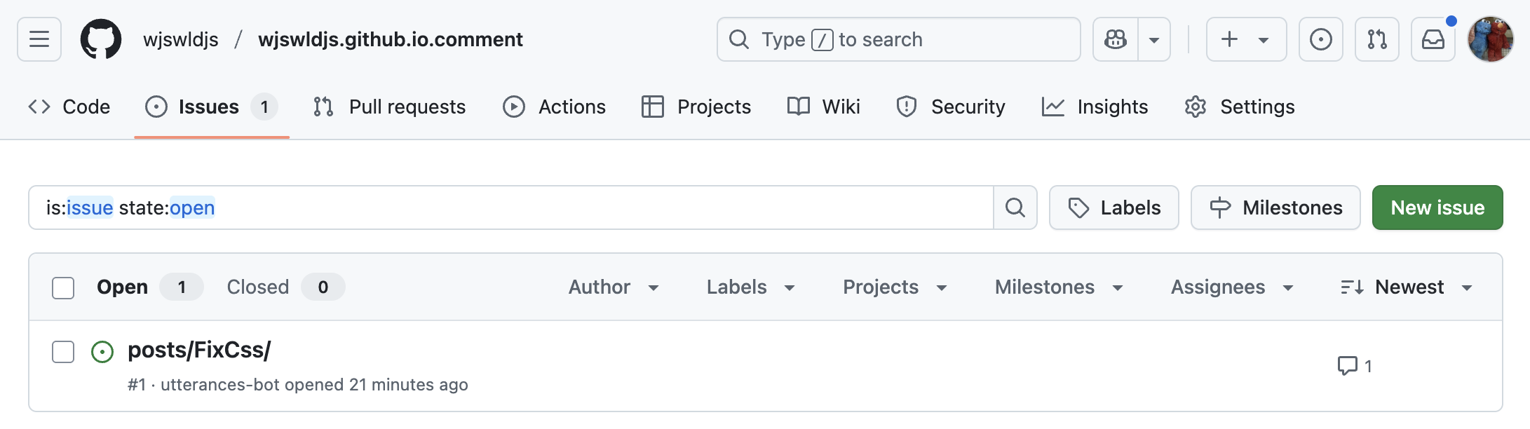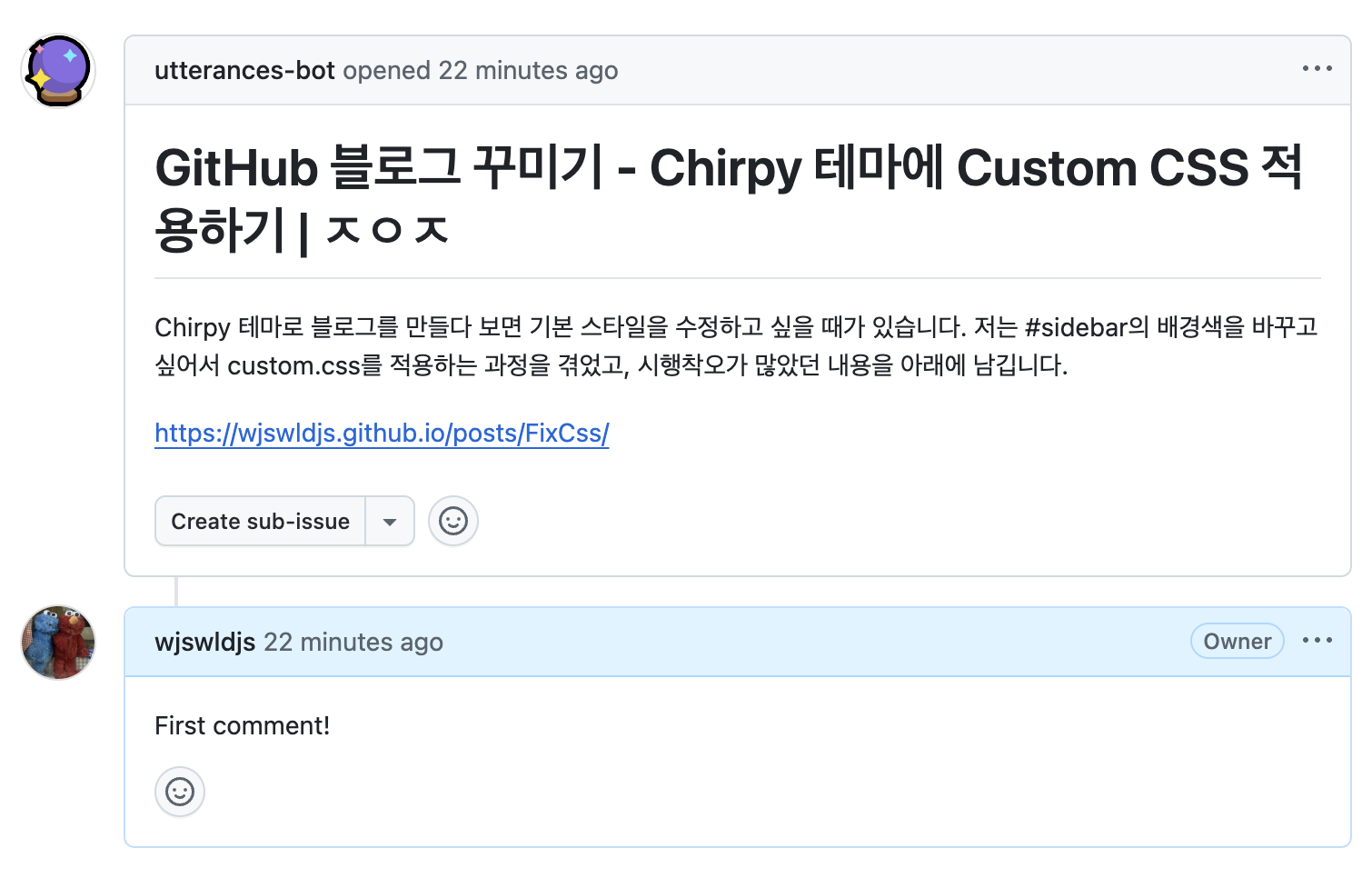 실제로 댓글을 달아보면 GitHub의 Issue 탭에서 게시글별로 댓글이 잘 정리되어 있는 걸 확인할 수 있습니다.